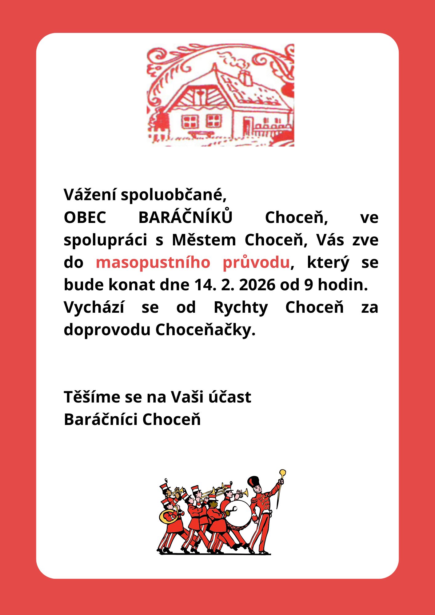 OBEC BARÁČNÍKŮ Choceň, ve spolupráci s Městem Choceň, Vás zve do masopustního průvodu, který se bude konat dne 14.2.2026 od 9 hodin.